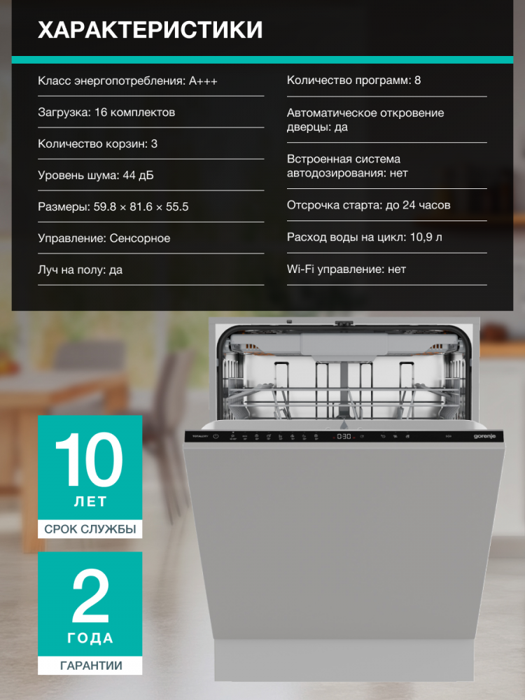 | Вид | Полностью встраиваемая посудомоечная машина |